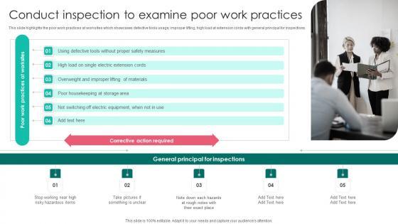 This slide highlights the poor work practices at worksites which showcases defective tools usage, improper lifting, high load at extension cords with general principal for inspections. Want to ace your presentation in front of a live audience Our Workplace Safety Best Practices Conduct Inspection To Examine Poor Work Practices Infographics PDF can help you do that by engaging all the users towards you. Slidegeeks experts have put their efforts and expertise into creating these impeccable powerpoint presentations so that you can communicate your ideas clearly. Moreover, all the templates are customizable, and easy to edit and downloadable. Use these for both personal and commercial use.