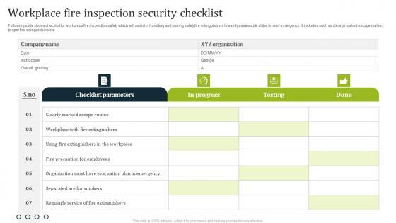 Following slide shows checklist for workplace fire inspection safety which will assist in handling and storing safely fire extinguishers to easily assessable at the time of emergency. It includes such as clearly marked escape routes, proper fire extinguishers etc. Showcasing this set of slides titled Workplace Fire Inspection Security Checklist Diagrams Pdf. The topics addressed in these templates are Checklist Parameters, Done, Testing. All the content presented in this PPT design is completely editable. Download it and make adjustments in color, background, font etc. as per your unique business setting. Following slide shows checklist for workplace fire inspection safety which will assist in handling and storing safely fire extinguishers to easily assessable at the time of emergency. It includes such as clearly marked escape routes, proper fire extinguishers etc.