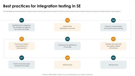 This slide highlights the optimal approaches of integration testing in software engineering. The purpose of this slide is to discuss the best practices of integration testing such as ensuring mock data, avoiding running test cases, etc. Are you in need of a template that can accommodate all of your creative concepts This one is crafted professionally and can be altered to fit any style. Use it with Google Slides or PowerPoint. Include striking photographs, symbols, depictions, and other visuals. Fill, move around, or remove text boxes as desired. Test out color palettes and font mixtures. Edit and save your work, or work with colleagues. Download Best Practices For Integration Testing In SE Smoke Testing Ppt Presentation and observe how to make your presentation outstanding. Give an impeccable presentation to your group and make your presentation unforgettable. This slide highlights the optimal approaches of integration testing in software engineering. The purpose of this slide is to discuss the best practices of integration testing such as ensuring mock data, avoiding running test cases, etc.