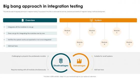 This slide discusses the big bang technique in integration testing. The purpose of this slide is to showcase the overview, drawbacks and benefits of integration testing in software development. Crafting an eye-catching presentation has never been more straightforward. Let your presentation shine with this tasteful yet straightforward Big Bang Approach In Integration Testing Smoke Testing Ppt Slides template. It offers a minimalistic and classy look that is great for making a statement. The colors have been employed intelligently to add a bit of playfulness while still remaining professional. Construct the ideal Big Bang Approach In Integration Testing Smoke Testing Ppt Slides that effortlessly grabs the attention of your audience Begin now and be certain to wow your customers This slide discusses the big bang technique in integration testing. The purpose of this slide is to showcase the overview, drawbacks and benefits of integration testing in software development.
