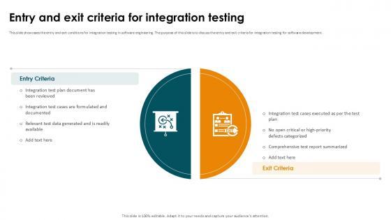 This slide showcases the entry and exit conditions for integration testing in software engineering. The purpose of this slide is to discuss the entry and exit criteria for integration testing for software development . Welcome to our selection of the Entry And Exit Criteria For Integration Testing Smoke Testing Ppt Slides. These are designed to help you showcase your creativity and bring your sphere to life. Planning and Innovation are essential for any business that is just starting out. This collection contains the designs that you need for your everyday presentations. All of our PowerPoints are 100Percent editable, so you can customize them to suit your needs. This multi-purpose template can be used in various situations. Grab these presentation templates today. This slide showcases the entry and exit conditions for integration testing in software engineering. The purpose of this slide is to discuss the entry and exit criteria for integration testing for software development .