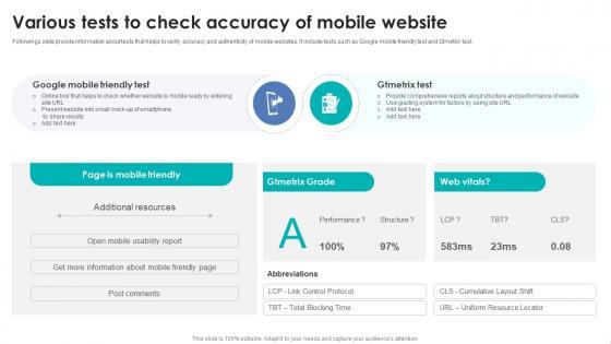 Followings slide provide information about tests that helps to verify accuracy and authenticity of mobile websites. It include tests such as Google mobile friendly test and Gtmetrix test. Slidegeeks is here to make your presentations a breeze with Integrating Automation For Effective Business Various Tests To Check Accuracy Of Mobile Website With our easy-to-use and customizable templates, you can focus on delivering your ideas rather than worrying about formatting. With a variety of designs to choose from, you are sure to find one that suits your needs. And with animations and unique photos, illustrations, and fonts, you can make your presentation pop. So whether you are giving a sales pitch or presenting to the board, make sure to check out Slidegeeks first. Followings slide provide information about tests that helps to verify accuracy and authenticity of mobile websites. It include tests such as Google mobile friendly test and Gtmetrix test.
