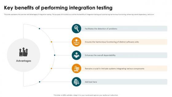 This slide represents the overview and advantages of integration testing. The purpose of this slide is to outline the benefits of integration testing such as ensuring harmonious functioning, enhancing overall dependency, and so on. Are you searching for a Key Benefits Of Performing Integration Smoke Testing Ppt Sample that is uncluttered, straightforward, and original Its easy to edit, and you can change the colors to suit your personal or business branding. For a presentation that expresses how much effort you have put in, this template is ideal With all of its features, including tables, diagrams, statistics, and lists, its perfect for a business plan presentation. Make your ideas more appealing with these professional slides. Download Key Benefits Of Performing Integration Smoke Testing Ppt Sample from Slidegeeks today. This slide represents the overview and advantages of integration testing. The purpose of this slide is to outline the benefits of integration testing such as ensuring harmonious functioning, enhancing overall dependency, and so on.