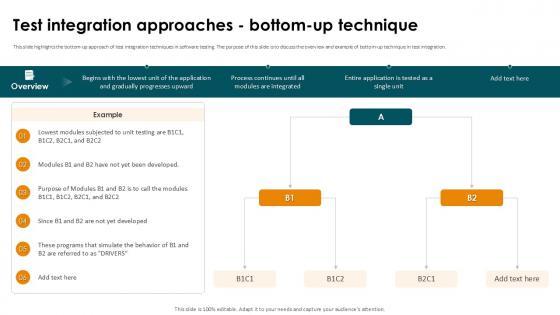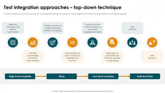 This slide showcases the overview of top-down approach in test integration techniques. The purpose of this slide is to highlight the introduction of top down technique in test integration approach. The best PPT templates are a great way to save time, energy, and resources. Slidegeeks have 100 percent editable powerpoint slides making them incredibly versatile. With these quality presentation templates, you can create a captivating and memorable presentation by combining visually appealing slides and effectively communicating your message. Download Test Integration Approaches Top Down Technique Smoke Testing Ppt Sample from Slidegeeks and deliver a wonderful presentation. This slide showcases the overview of top-down approach in test integration techniques. The purpose of this slide is to highlight the introduction of top down technique in test integration approach.