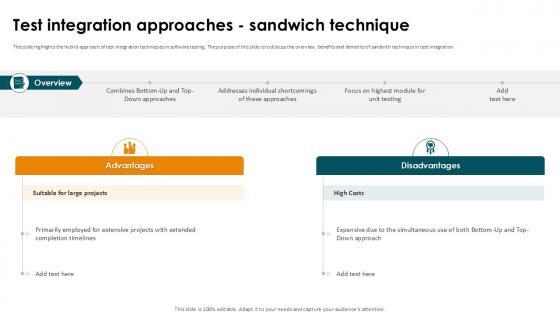 This slide highlights the hybrid approach of test integration techniques in software testing. The purpose of this slide is to discuss the overview, benefits and demerits of sandwich technique in test integration. Explore a selection of the finest Test Integration Approaches Sandwich Technique Smoke Testing Ppt Example here. With a plethora of professionally designed and pre-made slide templates, you can quickly and easily find the right one for your upcoming presentation. You can use our Test Integration Approaches Sandwich Technique Smoke Testing Ppt Example to effectively convey your message to a wider audience. Slidegeeks has done a lot of research before preparing these presentation templates. The content can be personalized and the slides are highly editable. Grab templates today from Slidegeeks. This slide highlights the hybrid approach of test integration techniques in software testing. The purpose of this slide is to discuss the overview, benefits and demerits of sandwich technique in test integration.