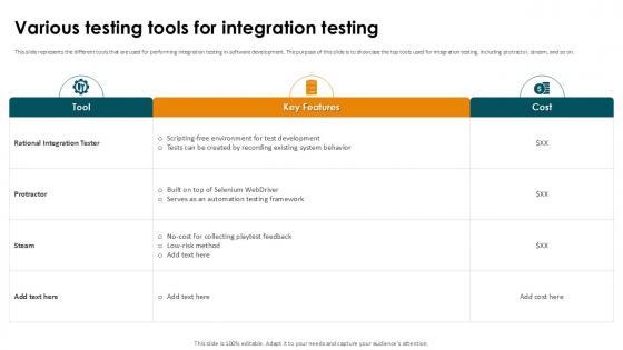 This slide represents the different tools that are used for performing integration testing in software development. The purpose of this slide is to showcase the top tools used for integration testing, including protractor, stream, and so on. Take your projects to the next level with our ultimate collection of Various Testing Tools For Integration Smoke Testing Ppt Slides. Slidegeeks has designed a range of layouts that are perfect for representing task or activity duration, keeping track of all your deadlines at a glance. Tailor these designs to your exact needs and give them a truly corporate look with your own brand colors they will make your projects stand out from the rest This slide represents the different tools that are used for performing integration testing in software development. The purpose of this slide is to showcase the top tools used for integration testing, including protractor, stream, and so on.