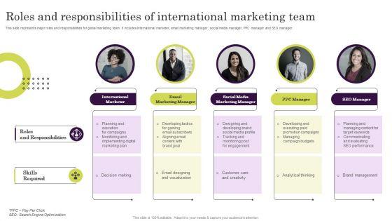 This slide represents major roles and responsibilities for global marketing team. It includes international marketer, email marketing manager, social media manager, PPC manager and SEO manager. If your project calls for a presentation, then Slidegeeks is your go-to partner because we have professionally designed, easy-to-edit templates that are perfect for any presentation. After downloading, you can easily edit Roles And Responsibilities International Marketing Team Formulating Global Marketing Strategy To Improve Themes PDF and make the changes accordingly. You can rearrange slides or fill them with different images. Check out all the handy templates