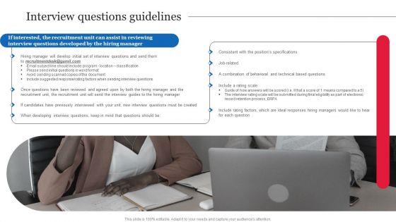 Do you know about Slidesgeeks Interview Questions Guidelines Strategic Guide On Talent Recruitment Graphics PDF These are perfect for delivering any kind od presentation. Using it, create PowerPoint presentations that communicate your ideas and engage audiences. Save time and effort by using our pre-designed presentation templates that are perfect for a wide range of topic. Our vast selection of designs covers a range of styles, from creative to business, and are all highly customizable and easy to edit. Download as a PowerPoint template or use them as Google Slides themes.