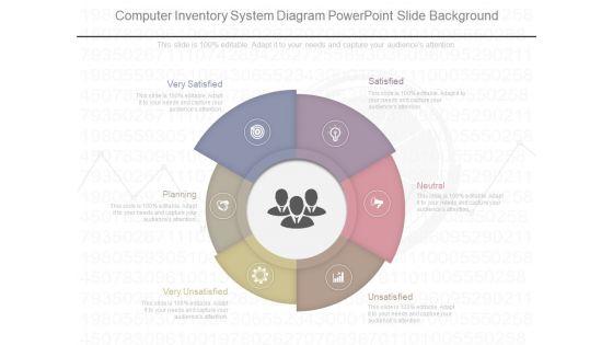 This is a computer inventory system diagram powerpoint slide background. This is a six stage process. The stages in this process are satisfied, neutral, unsatisfied, very unsatisfied, planning, very satisfied.