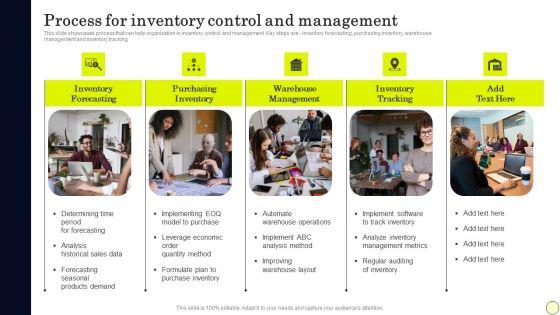 This slide showcases process that can help organization in inventory control and management. Key steps are inventory forecasting, purchasing inventory, warehouse management and inventory tracking. If your project calls for a presentation, then Slidegeeks is your go to partner because we have professionally designed, easy to edit templates that are perfect for any presentation. After downloading, you can easily edit Strategies To Order And Manage Ideal Inventory Levels Process For Inventory Control Download PDF and make the changes accordingly. You can rearrange slides or fill them with different images. Check out all the handy templates.
