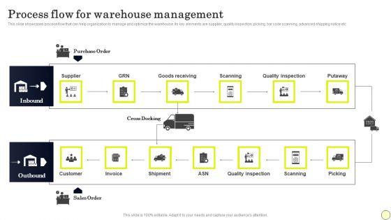 This slide showcases process flow that can help organization to manage and optimize the warehouse. Its key elements are supplier, quality inspection, picking, bar code scanning, advanced shipping notice etc. The best PPT templates are a great way to save time, energy, and resources. Slidegeeks have 100 percent editable powerpoint slides making them incredibly versatile. With these quality presentation templates, you can create a captivating and memorable presentation by combining visually appealing slides and effectively communicating your message. Download Strategies To Order And Manage Ideal Inventory Levels Process Flow For Warehouse Slides PDF from Slidegeeks and deliver a wonderful presentation.