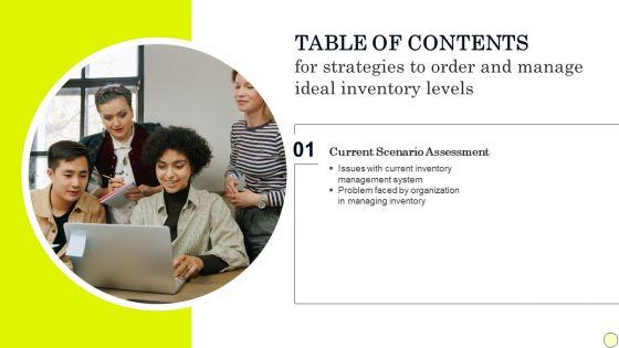 Slidegeeks has constructed Table Of Contents For Strategies To Order And Manage Ideal Inventory Levels Infographics PDF after conducting extensive research and examination. These presentation templates are constantly being generated and modified based on user preferences and critiques from editors. Here, you will find the most attractive templates for a range of purposes while taking into account ratings and remarks from users regarding the content. This is an excellent jumping off point to explore our content and will give new users an insight into our top notch PowerPoint Templates.
