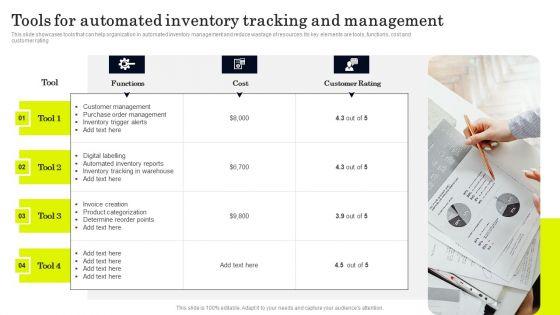 This slide showcases tools that can help organization in automated inventory management and reduce wastage of resources. Its key elements are tools, functions, cost and customer rating. Are you searching for a Strategies To Order And Manage Ideal Inventory Levels Tools For Automated Inventory Portrait PDF that is uncluttered, straightforward, and original Its easy to edit, and you can change the colors to suit your personal or business branding. For a presentation that expresses how much effort you have put in, this template is ideal With all of its features, including tables, diagrams, statistics, and lists, its perfect for a business plan presentation. Make your ideas more appealing with these professional slides. Download Strategies To Order And Manage Ideal Inventory Levels Tools For Automated Inventory Portrait PDF from Slidegeeks today.