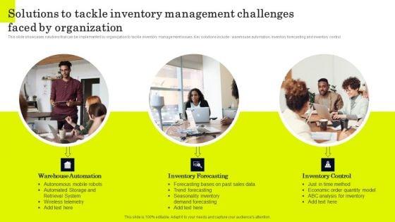 This slide showcases solutions that can be implemented by organization to tackle inventory management issues. Key solutions include warehouse automation, inventory forecasting and inventory control. Whether you have daily or monthly meetings, a brilliant presentation is necessary. Solutions To Tackle Inventory Management Challenges Faced By Organization Slides PDF can be your best option for delivering a presentation. Represent everything in detail using Solutions To Tackle Inventory Management Challenges Faced By Organization Slides PDF and make yourself stand out in meetings. The template is versatile and follows a structure that will cater to your requirements. All the templates prepared by Slidegeeks are easy to download and edit. Our research experts have taken care of the corporate themes as well. So, give it a try and see the results.