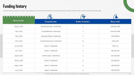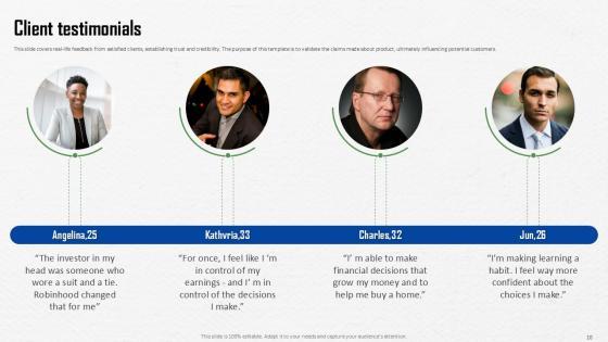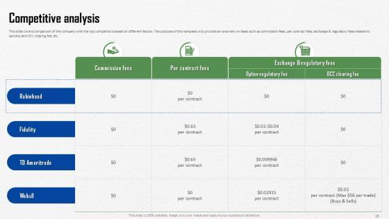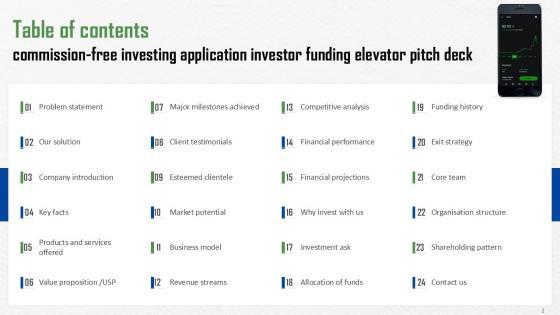 This Commission Free Investing Application Investor Funding Elevator Pitch Ppt Template is a primer on how to capitalize on business opportunities through planning, innovation, and market intelligence. The content-ready format of the complete deck will make your job as a decision-maker a lot easier. Use this ready-made PowerPoint Template to help you outline an extensive and legible plan to capture markets and grow your company on the right path, at an exponential pace. What is even more amazing is that this presentation is completely editable and 100 percent customizable. This thirty six slide complete deck helps you impress a roomful of people with your expertise in business and even presentation. Craft such a professional and appealing presentation for that amazing recall value. Download now. Our Commission Free Investing Application Investor Funding Elevator Pitch Ppt Template are topically designed to provide an attractive backdrop to any subject. Use them to look like a presentation pro.