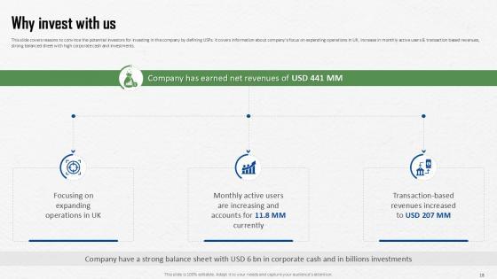 The following slide showcases different reasons for investing with our company. Information covered in this slide is related to strong brand equity, high market potential, and investing in creative and innovative technology. Explore a selection of the finest Why Invest With Us Virtual Meeting Investor Funding Elevator Pitch Deck PPT Template here. With a plethora of professionally designed and pre-made slide templates, you can quickly and easily find the right one for your upcoming presentation. You can use our Why Invest With Us Virtual Meeting Investor Funding Elevator Pitch Deck PPT Template to effectively convey your message to a wider audience. Slidegeeks has done a lot of research before preparing these presentation templates. The content can be personalized and the slides are highly editable. Grab templates today from Slidegeeks. The following slide showcases different reasons for investing with our company. Information covered in this slide is related to strong brand equity, high market potential, and investing in creative and innovative technology.