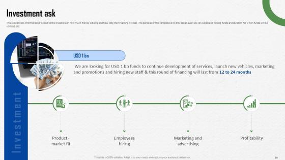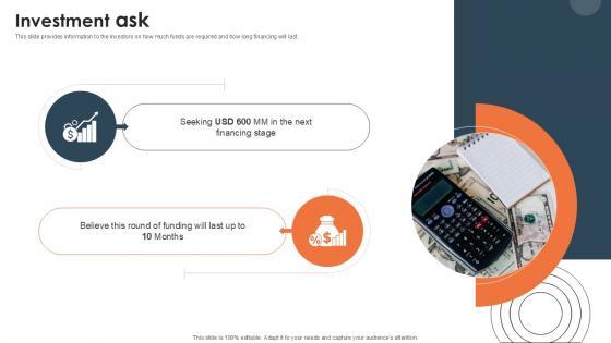 This slide provides information to the investors on how much funds are required and how long financing will last. Whether you have daily or monthly meetings, a brilliant presentation is necessary. Investment Ask Investor Funding Elevator Pitch Deck PPT Template can be your best option for delivering a presentation. Represent everything in detail using Investment Ask Investor Funding Elevator Pitch Deck PPT Template and make yourself stand out in meetings. The template is versatile and follows a structure that will cater to your requirements. All the templates prepared by Slidegeeks are easy to download and edit. Our research experts have taken care of the corporate themes as well. So, give it a try and see the results. This slide provides information to the investors on how much funds are required and how long financing will last.