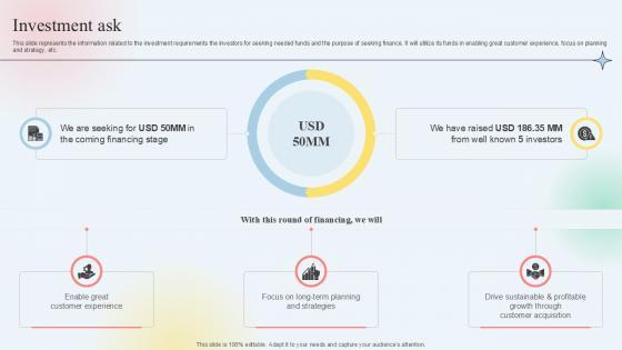 Purpose of this slide is to provide information to the investors on how much money the company is seeking for and where they will deploy it. Presenting this PowerPoint presentation, titled Investment Ask Series A Capital Funding Elevator Pitch Deck For Real Estate Slides PDF, with topics curated by our researchers after extensive research. This editable presentation is available for immediate download and provides attractive features when used. Download now and captivate your audience. Presenting this Investment Ask Series A Capital Funding Elevator Pitch Deck For Real Estate Slides PDF. Our researchers have carefully researched and created these slides with all aspects taken into consideration. This is a completely customizable Investment Ask Series A Capital Funding Elevator Pitch Deck For Real Estate Slides PDF that is available for immediate downloading. Download now and make an impact on your audience. Highlight the attractive features available with our PPTs.
