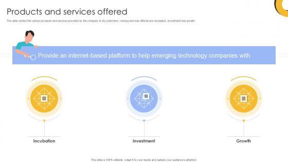 The slide carries the various products and services provided by the company to its customers. Various services offered are incubation, investment and growth. Do you have an important presentation coming up Are you looking for something that will make your presentation stand out from the rest Look no further than Products And Services Offered Investment Company Investor Funding Elevator Ppt Slide. With our professional designs, you can trust that your presentation will pop and make delivering it a smooth process. And with Slidegeeks, you can trust that your presentation will be unique and memorable. So why wait Grab Products And Services Offered Investment Company Investor Funding Elevator Ppt Slide today and make your presentation stand out from the rest The slide carries the various products and services provided by the company to its customers. Various services offered are incubation, investment and growth