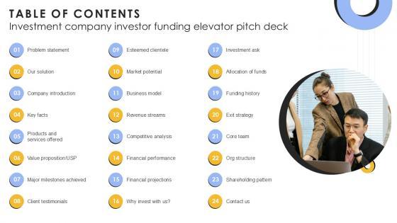 If your project calls for a presentation, then Slidegeeks is your go-to partner because we have professionally designed, easy-to-edit templates that are perfect for any presentation. After downloading, you can easily edit Table Of Contents Investment Company Investor Funding Elevator Ppt Powerpoint and make the changes accordingly. You can rearrange slides or fill them with different images. Check out all the handy templates Our Table Of Contents Investment Company Investor Funding Elevator Ppt Powerpoint are topically designed to provide an attractive backdrop to any subject. Use them to look like a presentation pro.