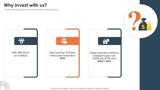 This slide represents the reasons for why should investors put their money with us. Explore a selection of the finest Why Invest With Us Investor Funding Elevator Pitch Deck PPT Slide here. With a plethora of professionally designed and pre-made slide templates, you can quickly and easily find the right one for your upcoming presentation. You can use our Why Invest With Us Investor Funding Elevator Pitch Deck PPT Slide to effectively convey your message to a wider audience. Slidegeeks has done a lot of research before preparing these presentation templates. The content can be personalized and the slides are highly editable. Grab templates today from Slidegeeks. This slide represents the reasons for why should investors put their money with us.
