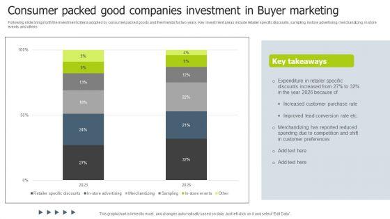 Following slide brings forth the investment criteria adopted by consumer packed goods and their trends for two years. Key investment areas include retailer specific discounts, sampling, instore advertising, merchandizing, in store events and others Showcasing this set of slides titled Consumer Packed Good Companies Investment In Buyer Marketing Infographics PDF. The topics addressed in these templates are Key Takeaways, Buyer Marketing, Purchase Rate. All the content presented in this PPT design is completely editable. Download it and make adjustments in color, background, font etc. as per your unique business setting.