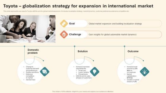 This slide represents use case for Toyota with the aim for global market expansion. It includes localization strategy, market dynamics, customer preferences extensive competition etc.Do you have to make sure that everyone on your team knows about any specific topic I yes, then you should give Toyota Globalization Strategy For Expansion International Marketing Strategy Topics Pdf a try. Our experts have put a lot of knowledge and effort into creating this impeccable Toyota Globalization Strategy For Expansion International Marketing Strategy Topics Pdf. You can use this template for your upcoming presentations, as the slides are perfect to represent even the tiniest detail. You can download these templates from the Slidegeeks website and these are easy to edit. So grab these today. This slide represents use case for Toyota with the aim for global market expansion. It includes localization strategy, market dynamics, customer preferences extensive competition etc.