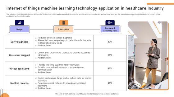 The following slide highlights the use of AI and IoT technology in the healthcare industry that can be used to reduce manual errors and increase accuracy. Key benefits are early diagnosis, customer support, virtual assistants, and medical records. Persuade your audience using this Internet Of Things Machine Learning Technology Application In Healthcare Industry Formats PDF. This PPT design covers one stages, thus making it a great tool to use. It also caters to a variety of topics including Early Diagnosis, Customer Support, Virtual Assistants, Medical Records. Download this PPT design now to present a convincing pitch that not only emphasizes the topic but also showcases your presentation skills.