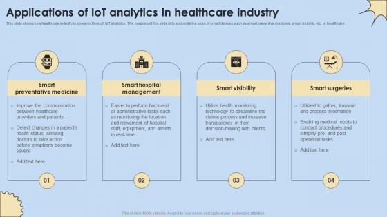 This slide shows how healthcare industry is powered through IoT analytics. The purpose of this slide is to elaborate the uses of smart devices such as smart preventive medicine, smart visibility, etc. in healthcare. Slidegeeks is one of the best resources for PowerPoint templates. You can download easily and regulate Applications Of IoT Analytics In Healthcare Industry Internet Of Things Analysis Portrait Pdf for your personal presentations from our wonderful collection. A few clicks is all it takes to discover and get the most relevant and appropriate templates. Use our Templates to add a unique zing and appeal to your presentation and meetings. All the slides are easy to edit and you can use them even for advertisement purposes. This slide shows how healthcare industry is powered through IoT analytics. The purpose of this slide is to elaborate the uses of smart devices such as smart preventive medicine, smart visibility, etc. in healthcare.