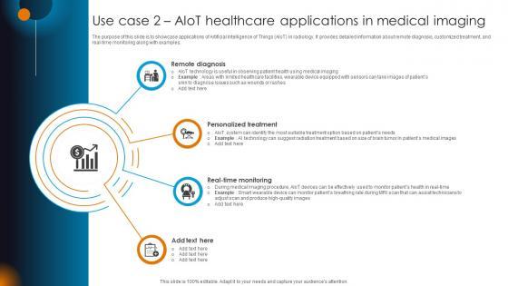 The purpose of this slide is to showcase applications of Artificial Intelligence of Things AIoT in radiology. It provides detailed information about remote diagnosis, customized treatment, and real-time monitoring along with examples. Welcome to our selection of the Integrating AI With IoT Use Case 2 AIoT Healthcare Applications In Medical Imaging IoT SS V. These are designed to help you showcase your creativity and bring your sphere to life. Planning and Innovation are essential for any business that is just starting out. This collection contains the designs that you need for your everyday presentations. All of our PowerPoints are 100Percent editable, so you can customize them to suit your needs. This multi-purpose template can be used in various situations. Grab these presentation templates today. The purpose of this slide is to showcase applications of Artificial Intelligence of Things AIoT in radiology. It provides detailed information about remote diagnosis, customized treatment, and real-time monitoring along with examples.