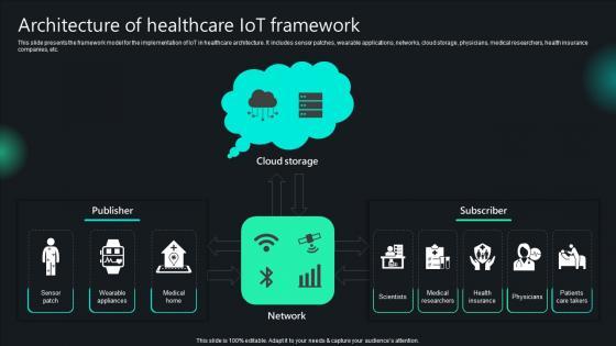 This slide presents the framework model for the implementation of IoT in healthcare architecture. It includes sensor patches, wearable applications, networks, cloud storage, physicians, medical researchers, health insurance companies, etc. Do you have an important presentation coming up Are you looking for something that will make your presentation stand out from the rest Look no further than Unlocking Potential IoTs Application Architecture Of Healthcare IoT Framework IoT SS V. With our professional designs, you can trust that your presentation will pop and make delivering it a smooth process. And with Slidegeeks, you can trust that your presentation will be unique and memorable. So why wait Grab Unlocking Potential IoTs Application Architecture Of Healthcare IoT Framework IoT SS V today and make your presentation stand out from the rest This slide presents the framework model for the implementation of IoT in healthcare architecture. It includes sensor patches, wearable applications, networks, cloud storage, physicians, medical researchers, health insurance companies, etc.