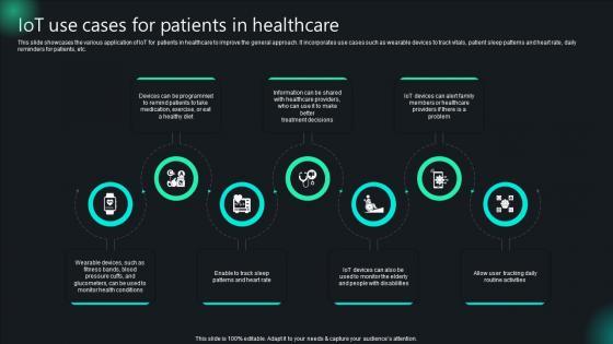 This slide showcases the various application of IoT for patients in healthcare to improve the general approach. It incorporates use cases such as wearable devices to track vitals, patient sleep patterns and heart rate, daily reminders for patients, etc. Do you know about Slidesgeeks Unlocking Potential IoTs Application IoT Use Cases For Patients In Healthcare IoT SS V These are perfect for delivering any kind od presentation. Using it, create PowerPoint presentations that communicate your ideas and engage audiences. Save time and effort by using our pre-designed presentation templates that are perfect for a wide range of topic. Our vast selection of designs covers a range of styles, from creative to business, and are all highly customizable and easy to edit. Download as a PowerPoint template or use them as Google Slides themes. This slide showcases the various application of IoT for patients in healthcare to improve the general approach. It incorporates use cases such as wearable devices to track vitals, patient sleep patterns and heart rate, daily reminders for patients, etc.
