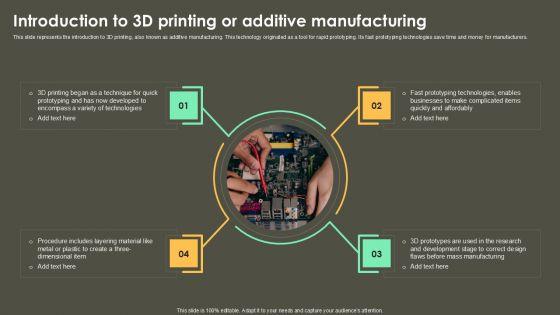 This slide represents the introduction to 3D printing, also known as additive manufacturing. This technology originated as a tool for rapid prototyping. Its fast prototyping technologies save time and money for manufacturers. Find a pre-designed and impeccable Iot Integration In Manufacturing Introduction To 3D Printing Or Additive Manufacturing Topics PDF.zip. The templates can ace your presentation without additional effort. You can download these easy-to-edit presentation templates to make your presentation stand out from others. So, what are you waiting for Download the template from Slidegeeks today and give a unique touch to your presentation.