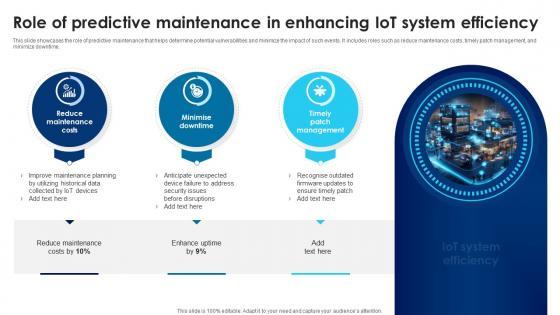 This slide showcases the role of predictive maintenance that helps determine potential vulnerabilities and minimize the impact of such events. It includes roles such as reduce maintenance costs, timely patch management, and minimize downtime. From laying roadmaps to briefing everything in detail, our templates are perfect for you. You can set the stage with your presentation slides. All you have to do is download these easy-to-edit and customizable templates. Building Trust With IoT Security Role Of Predictive Maintenance In Enhancing IoT System Efficiency IoT SS V will help you deliver an outstanding performance that everyone would remember and praise you for. Do download this presentation today. This slide showcases the role of predictive maintenance that helps determine potential vulnerabilities and minimize the impact of such events. It includes roles such as reduce maintenance costs, timely patch management, and minimize downtime.
