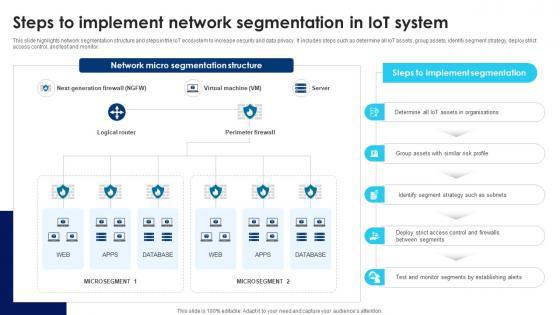 This slide highlights network segmentation structure and steps in the IoT ecosystem to increase security and data privacy. It includes steps such as determine all IoT assets, group assets, identify segment strategy, deploy strict access control, and test and monitor. Slidegeeks is here to make your presentations a breeze with Building Trust With IoT Security Steps To Implement Network Segmentation In IoT System IoT SS V With our easy-to-use and customizable templates, you can focus on delivering your ideas rather than worrying about formatting. With a variety of designs to choose from, you are sure to find one that suits your needs. And with animations and unique photos, illustrations, and fonts, you can make your presentation pop. So whether you are giving a sales pitch or presenting to the board, make sure to check out Slidegeeks first This slide highlights network segmentation structure and steps in the IoT ecosystem to increase security and data privacy. It includes steps such as determine all IoT assets, group assets, identify segment strategy, deploy strict access control, and test and monitor.