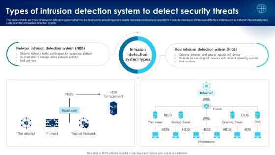 This slide exhibits two types of intrusion detection systems that may be deployed to provide layered security and enhance business operations. It includes two types of intrusion detection system such as network intrusion detection system and host intrusion detection system. Do you have an important presentation coming up Are you looking for something that will make your presentation stand out from the rest Look no further than Building Trust With IoT Security Types Of Intrusion Detection System To Detect Security Threats IoT SS V. With our professional designs, you can trust that your presentation will pop and make delivering it a smooth process. And with Slidegeeks, you can trust that your presentation will be unique and memorable. So why wait Grab Building Trust With IoT Security Types Of Intrusion Detection System To Detect Security Threats IoT SS V today and make your presentation stand out from the rest This slide exhibits two types of intrusion detection systems that may be deployed to provide layered security and enhance business operations. It includes two types of intrusion detection system such as network intrusion detection system and host intrusion detection system.