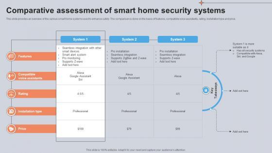 This slide provides an overview of the various smart home systems used to enhance safety. The comparison is done on the basis of features, compatible voice assistants, rating, installation type and price. Do you have to make sure that everyone on your team knows about any specific topic I yes, then you should give Comparative Assessment Of Smart Home Security Systems Utilizing Smart Appliances IoT SS V a try. Our experts have put a lot of knowledge and effort into creating this impeccable Comparative Assessment Of Smart Home Security Systems Utilizing Smart Appliances IoT SS V. You can use this template for your upcoming presentations, as the slides are perfect to represent even the tiniest detail. You can download these templates from the Slidegeeks website and these are easy to edit. So grab these today This slide provides an overview of the various smart home systems used to enhance safety. The comparison is done on the basis of features, compatible voice assistants, rating, installation type and price.