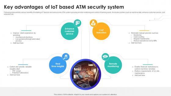 Following slide exhibits various benefits of installing IoT devices and sensors into ATM system assuring remote monitoring and control of banking assts. It includes pointers such as real time data, enhance customer service, cost reduction, etc. This modern and well-arranged Key Advantages Of IoT Based Atm Security System IoT In Banking For Digital Future IoT SS V provides lots of creative possibilities. It is very simple to customize and edit with the Powerpoint Software. Just drag and drop your pictures into the shapes. All facets of this template can be edited with Powerpoint, no extra software is necessary. Add your own material, put your images in the places assigned for them, adjust the colors, and then you can show your slides to the world, with an animated slide included. Following slide exhibits various benefits of installing IoT devices and sensors into ATM system assuring remote monitoring and control of banking assts. It includes pointers such as real time data, enhance customer service, cost reduction, etc.
