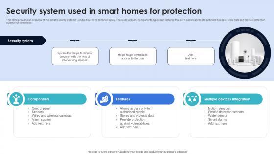 This slide provides an overview of the smart security systems used in houses to enhance safety. The slide includes components, types and features that are it allows access to authorized people, store data and provide protection against vulnerabilities. This Optimization Of IoT Remote Monitoring Security System Used In Smart Homes For Protection IoT SS V is perfect for any presentation, be it in front of clients or colleagues. It is a versatile and stylish solution for organizing your meetings. The Optimization Of IoT Remote Monitoring Security System Used In Smart Homes For Protection IoT SS V features a modern design for your presentation meetings. The adjustable and customizable slides provide unlimited possibilities for acing up your presentation. Slidegeeks has done all the homework before launching the product for you. So, do not wait, grab the presentation templates today This slide provides an overview of the smart security systems used in houses to enhance safety. The slide includes components, types and features that are it allows access to authorized people, store data and provide protection against vulnerabilities.