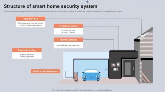 This slide provides an overview of the structure of a smart security system. It includes solar roof tile, smart delivery box, multi-charing points, front door and thermal cameras. Slidegeeks is one of the best resources for PowerPoint templates. You can download easily and regulate Structure Of Smart Home Security System Utilizing Smart Appliances IoT SS V for your personal presentations from our wonderful collection. A few clicks is all it takes to discover and get the most relevant and appropriate templates. Use our Templates to add a unique zing and appeal to your presentation and meetings. All the slides are easy to edit and you can use them even for advertisement purposes. This slide provides an overview of the structure of a smart security system. It includes solar roof tile, smart delivery box, multi-charing points, front door and thermal cameras.