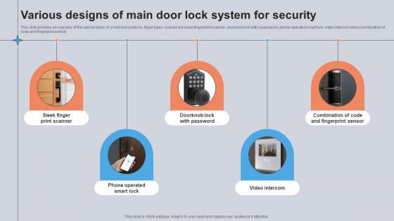 This slide provides an overview of the various types of smart lock systems. Major types covered are sleek fingerprint scanner, doorknob lock with a password, phone-operated smart lock, video intercom and a combination of code and fingerprint sensor. If your project calls for a presentation, then Slidegeeks is your go-to partner because we have professionally designed, easy-to-edit templates that are perfect for any presentation. After downloading, you can easily edit Various Designs Of Main Door Lock System For Security Utilizing Smart Appliances IoT SS V and make the changes accordingly. You can rearrange slides or fill them with different images. Check out all the handy templates This slide provides an overview of the various types of smart lock systems. Major types covered are sleek fingerprint scanner, doorknob lock with a password, phone-operated smart lock, video intercom and a combination of code and fingerprint sensor.