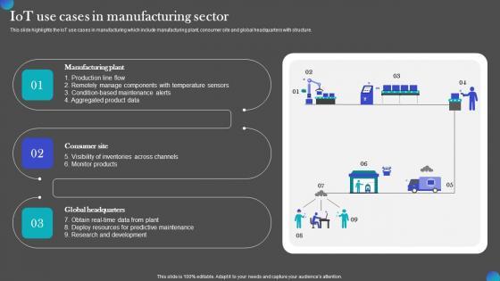 This slide highlights the IoT use cases in manufacturing which include manufacturing plant, consumer site and global headquarters with structure. Are you searching for a IOT Use Cases In Manufacturing Sector IOT Adoption Manufacturing Template PDF that is uncluttered, straightforward, and original Its easy to edit, and you can change the colors to suit your personal or business branding. For a presentation that expresses how much effort you have put in, this template is ideal With all of its features, including tables, diagrams, statistics, and lists, its perfect for a business plan presentation. Make your ideas more appealing with these professional slides. Download IOT Use Cases In Manufacturing Sector IOT Adoption Manufacturing Template PDF from Slidegeeks today. This slide highlights the IoT use cases in manufacturing which include manufacturing plant, consumer site and global headquarters with structure.