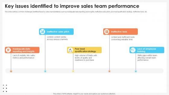 This slide outlines common challenges identified faced by sales representatives such as inadequate data reporting and insights, ineffective sales pitch, poor lead qualification strategy, ineffective tools, etc. The Business Development Team Key Issues Identified To Improve Sales Team Performance SA SS V is a compilation of the most recent design trends as a series of slides. It is suitable for any subject or industry presentation, containing attractive visuals and photo spots for businesses to clearly express their messages. This template contains a variety of slides for the user to input data, such as structures to contrast two elements, bullet points, and slides for written information. Slidegeeks is prepared to create an impression. This slide outlines common challenges identified faced by sales representatives such as inadequate data reporting and insights, ineffective sales pitch, poor lead qualification strategy, ineffective tools, etc.