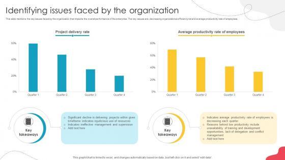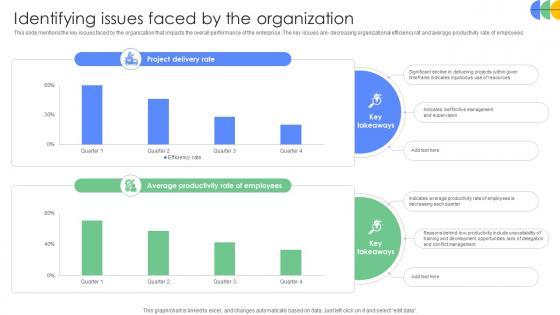 This slide mentions the key issues faced by the organization that impacts the overall performance of the enterprise. The key issues are- decreasing organizational efficiency rat and average productivity rate of employees. If your project calls for a presentation, then Slidegeeks is your go-to partner because we have professionally designed, easy-to-edit templates that are perfect for any presentation. After downloading, you can easily edit Unlocking Potential Enhancing Identifying Issues Faced By The Organization and make the changes accordingly. You can rearrange slides or fill them with different images. Check out all the handy templates This slide mentions the key issues faced by the organization that impacts the overall performance of the enterprise. The key issues are- decreasing organizational efficiency rat and average productivity rate of employees.