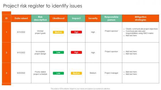 Crafting an eye-catching presentation has never been more straightforward. Let your presentation shine with this tasteful yet straightforward Project Risk Register To Identify Issues Ppt PowerPoint Presentation File Layouts PDF template. It offers a minimalistic and classy look that is great for making a statement. The colors have been employed intelligently to add a bit of playfulness while still remaining professional. Construct the ideal Project Risk Register To Identify Issues Ppt PowerPoint Presentation File Layouts PDF that effortlessly grabs the attention of your audience Begin now and be certain to wow your customers.