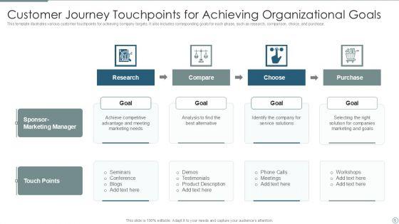 This template illustrates various customer touchpoints for achieving company targets. It also includes corresponding goals for each phase, such as research, comparison, choice, and purchase. Showcasing this set of slides titled Customer Journey Touchpoints For Achieving Organizational Goals Background PDF. The topics addressed in these templates are Goal, Marketing Manager, Purchase. All the content presented in this PPT design is completely editable. Download it and make adjustments in color, background, font etc. as per your unique business setting.