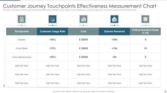 This slide covers table for tracking customer touchpoint effectiveness. It includes various scales for measurement such as customer usage rate, cost queries resolved, and critical question scale. Pitch your topic with ease and precision using this Customer Journey Touchpoints Effectiveness Measurement Chart Guidelines PDF. This layout presents information on Social Media, Online Advertisement, Customer Usage Rate. It is also available for immediate download and adjustment. So, changes can be made in the color, design, graphics or any other component to create a unique layout.