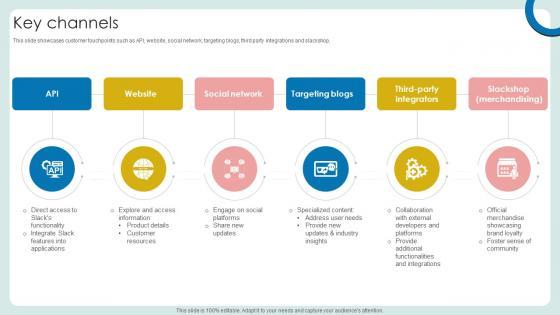This slide showcases customer touchpoints such as API, website, social network, targeting blogs, third party integrations and slackshop. From laying roadmaps to briefing everything in detail, our templates are perfect for you. You can set the stage with your presentation slides. All you have to do is download these easy-to-edit and customizable templates. Key Channels Cloud Based Communication Platform Business Model BMC SS V will help you deliver an outstanding performance that everyone would remember and praise you for. Do download this presentation today. This slide showcases customer touchpoints such as API, website, social network, targeting blogs, third party integrations and slackshop.