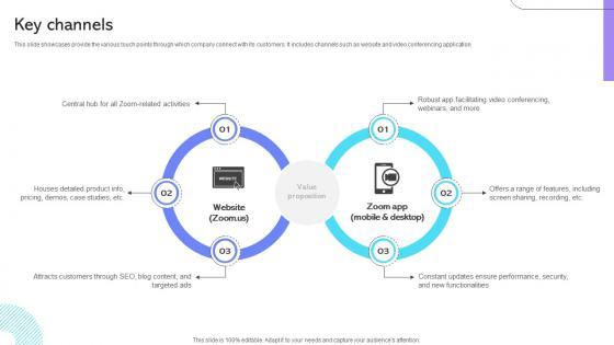This slide showcases provide the various touch points through which company connect with its customers. It includes channels such as website and video conferencing application. From laying roadmaps to briefing everything in detail, our templates are perfect for you. You can set the stage with your presentation slides. All you have to do is download these easy-to-edit and customizable templates. Key Channels Cloud Communication Company Business Model BMC SS V will help you deliver an outstanding performance that everyone would remember and praise you for. Do download this presentation today. This slide showcases provide the various touch points through which company connect with its customers. It includes channels such as website and video conferencing application.