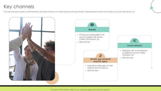 This slide showcases companys content distribution channels for enhancing community experiences through websites, mobile applications android and iOS apps and social media networks, etc. From laying roadmaps to briefing everything in detail, our templates are perfect for you. You can set the stage with your presentation slides. All you have to do is download these easy-to-edit and customizable templates. Key Channels Community Networking Platform Business Model will help you deliver an outstanding performance that everyone would remember and praise you for. Do download this presentation today. This slide showcases companys content distribution channels for enhancing community experiences through websites, mobile applications android and iOS apps and social media networks, etc.